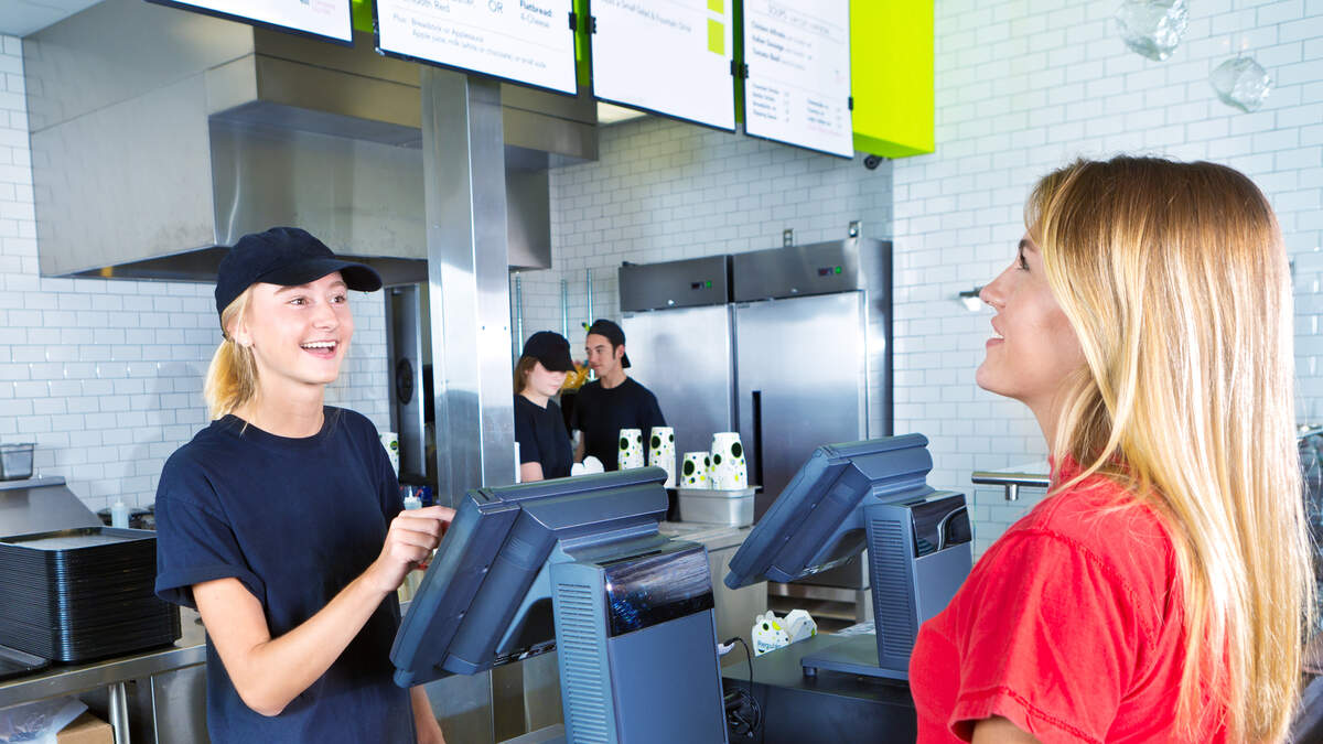 Checkout Server Serving Young Woman Customer Ordering at Fast Food Restaurant