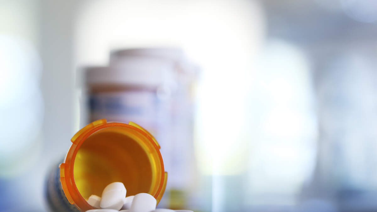 Pills Pour Out Of Prescription Medication Bottle Onto Kitchen Counter