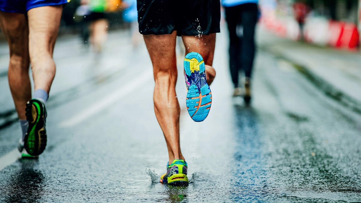 water sprays from under running shoes runner men